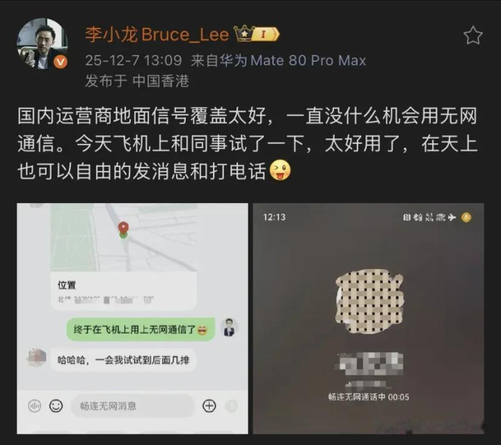 华为终端业务群首席技术官Bruce Lee(李小龙) 透露,全新的Mate 80 无网通信通话功能即使在飞行模式下也能正常工作,且毫无卡顿。他通过微博分享这一功能: